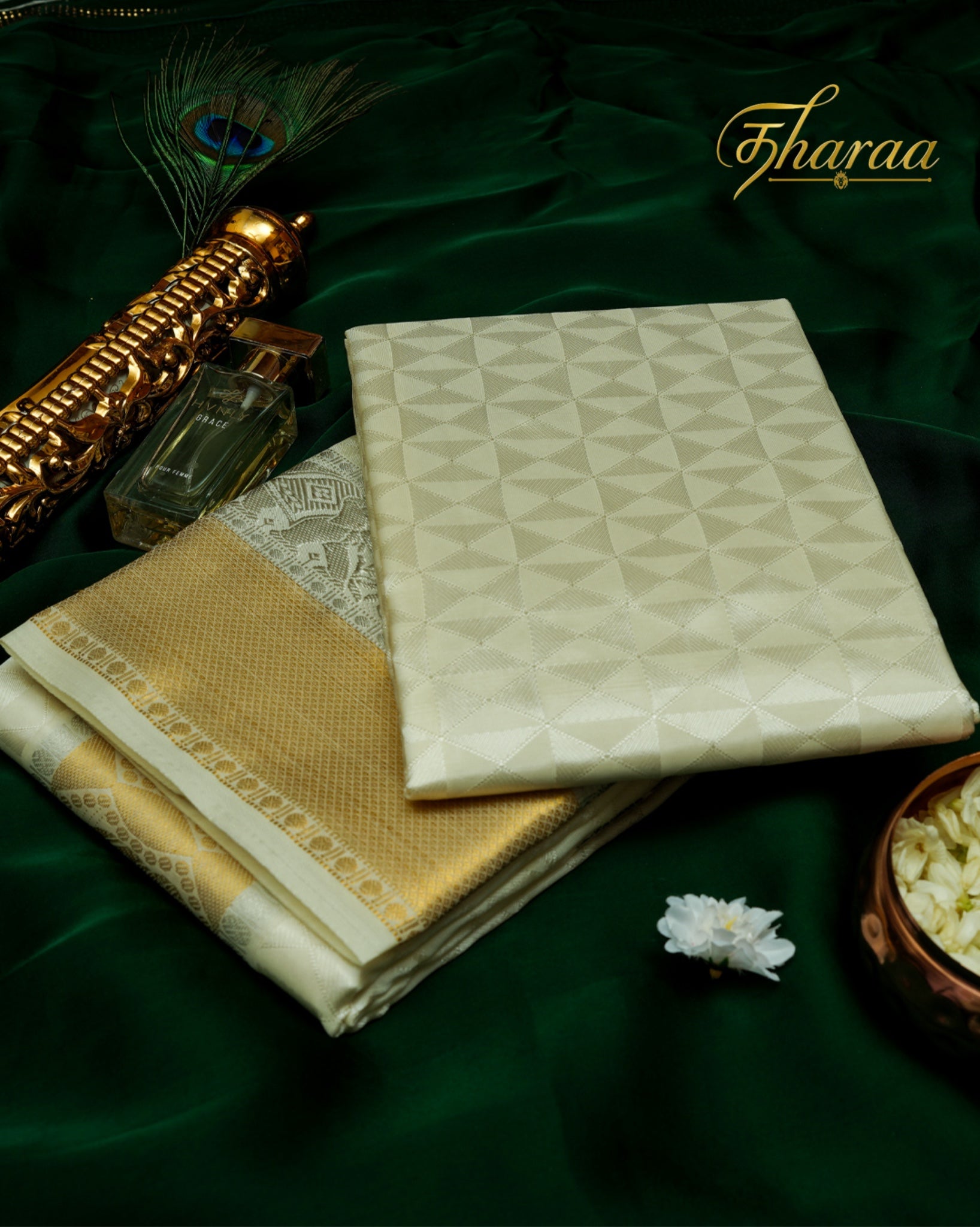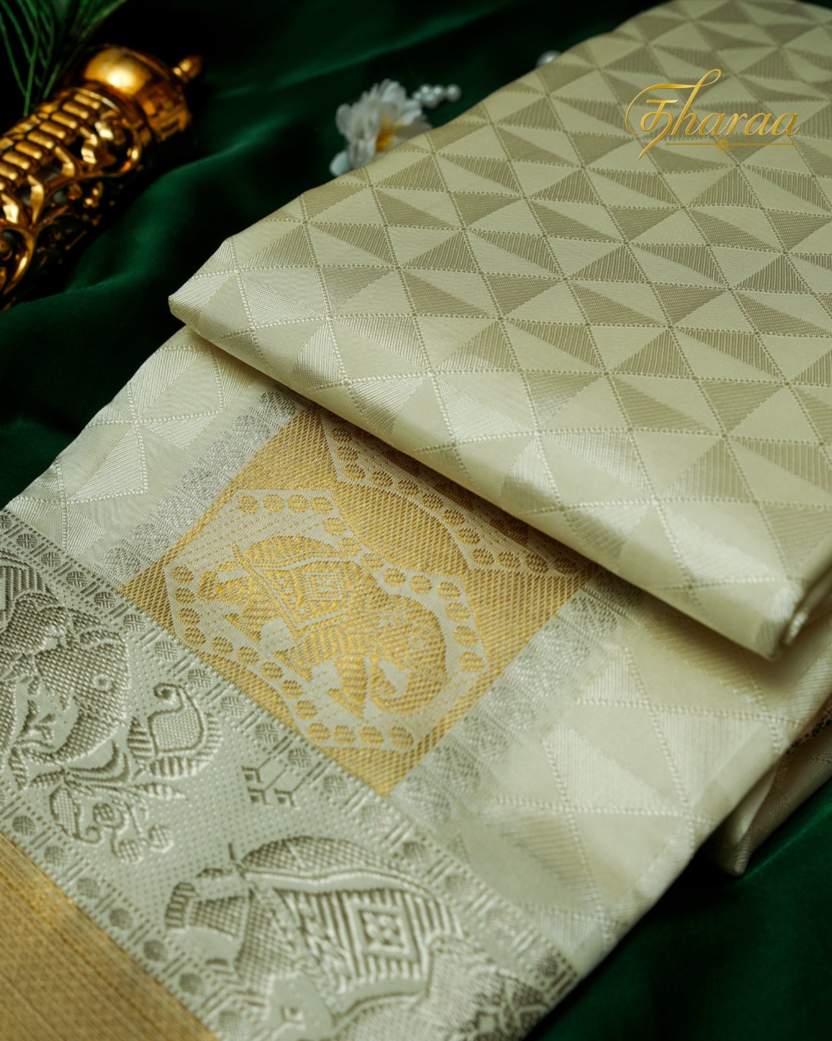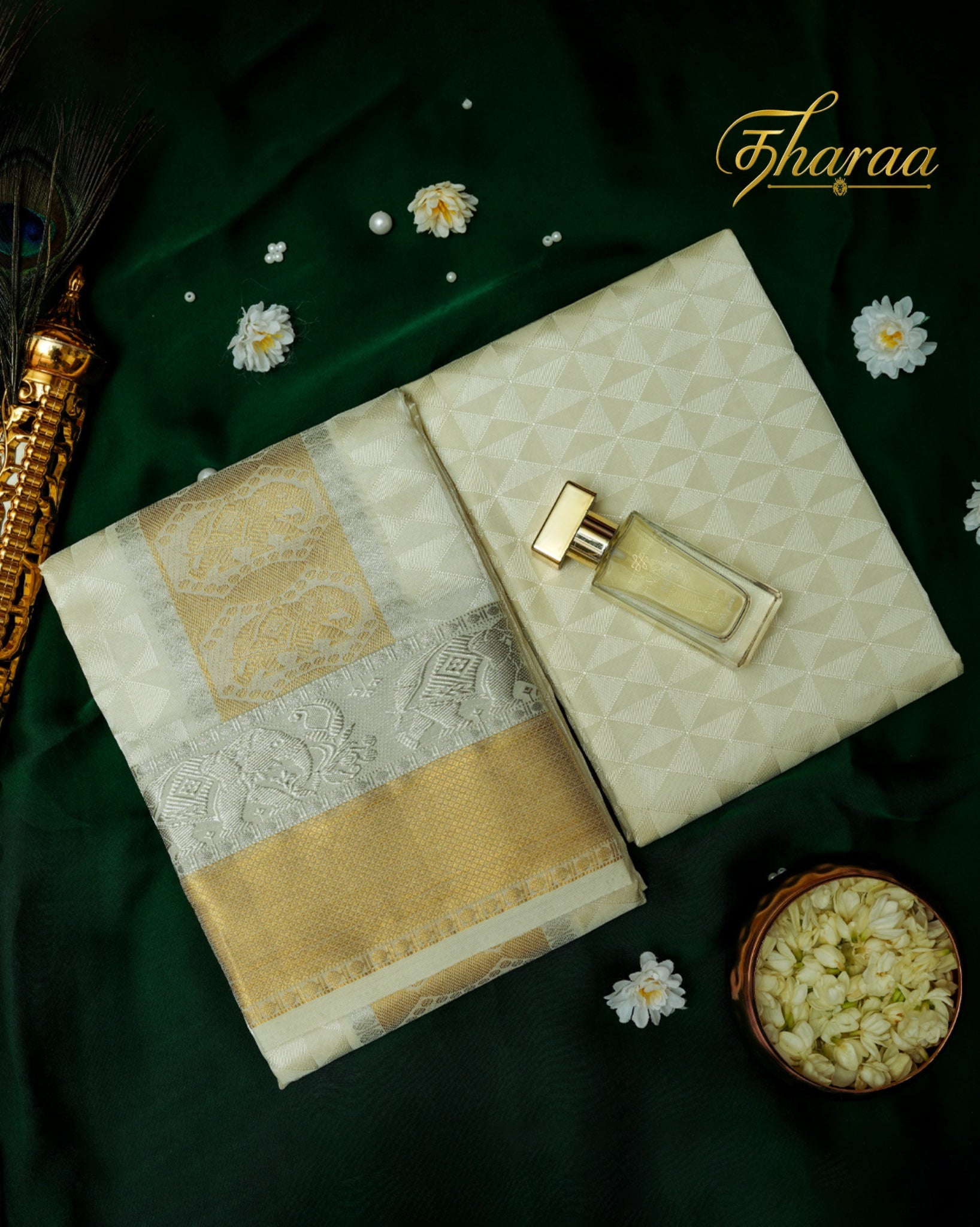 Introducing Vishwamitra, an off white semi silk emboss dhoti that features a stunning elephant border with silver and gold accents. With its stylish and intricate design, this dhoti is perfect for special occasions and adds an elegant touch to any traditional attire.